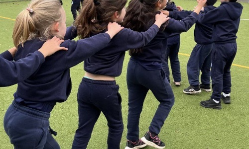 In PE, Year 2 focus on sending and receiving skills. Activities include rolling, throwing, and catching the ball in pairs and small groups. Children copy and follow each other’s movements, demonstrating teamwork and listening.
